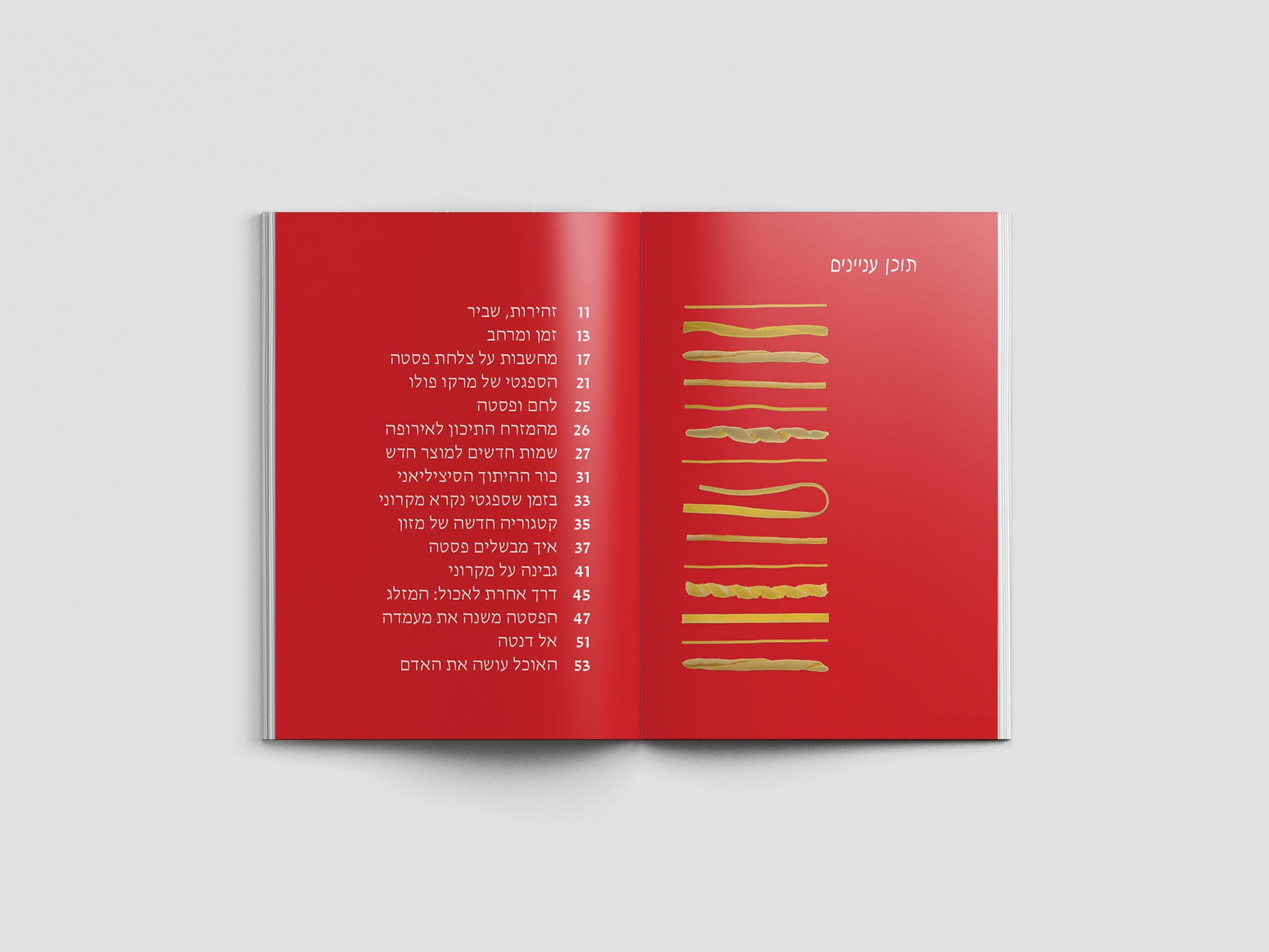 The Table of Contents reimagined as a culinary menu. By using distinct pasta shapes as visual markers and high-contrast white typography on the primary brand red, the interface ensures maximum legibility while maintaining a bold, immersive brand identity.